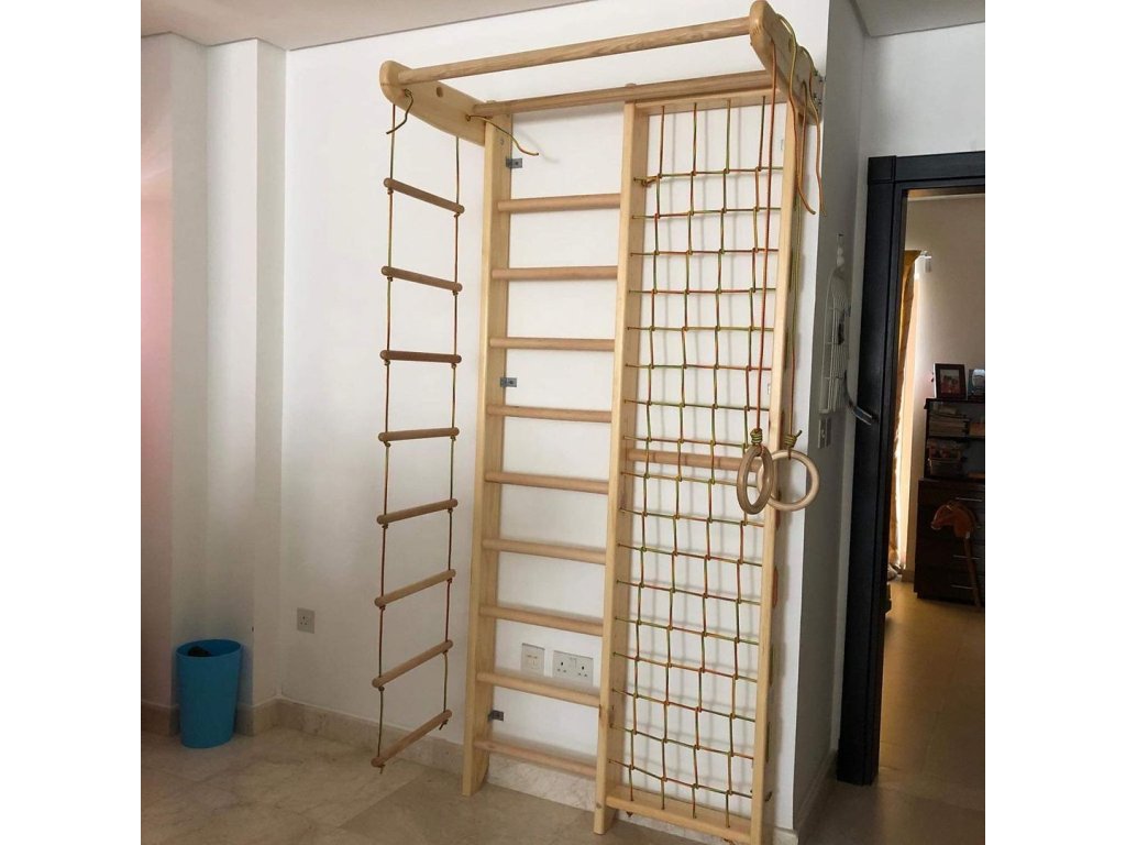 Žebřiny jsou vhodné do každého interiéru – od dětského pokoje po tělocvičnu. Šplhací stěna s lanovou sítí představuje atraktivní výzvu pro malé horolezce již od 2 let věku. Povrchy jsou pečlivě broušené a rohy zaoblené pro maximální bezpečnost.