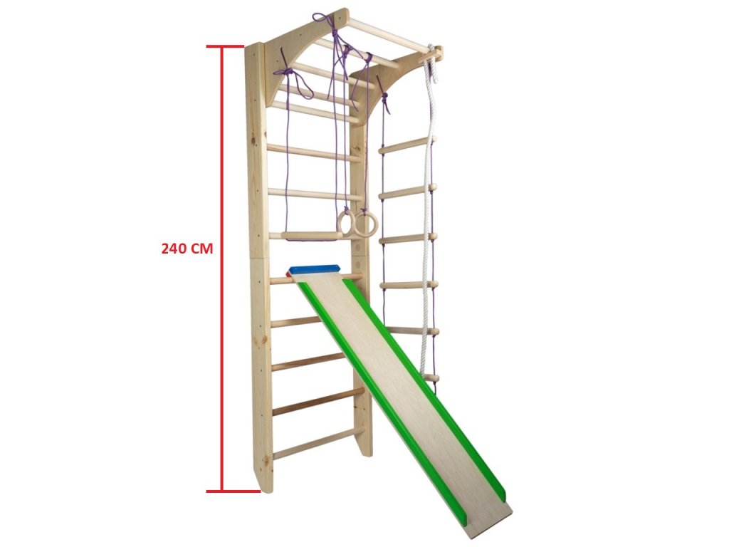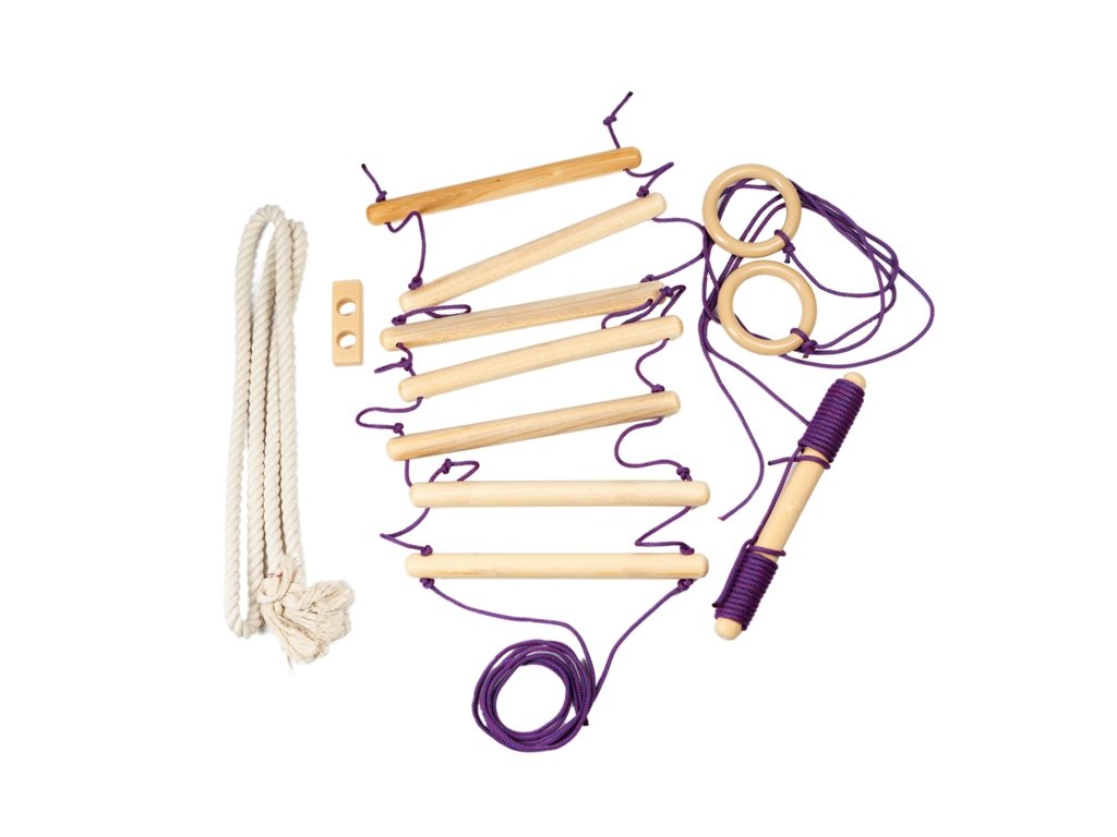 Součástí této sestavy je také příslušenství, jako jsou lana a další doplňky, které rozšiřují možnosti cvičení a přidávají zábavný prvek pro malé sportovce. Skvělá volba pro každou domácnost, školku nebo dětský koutek.